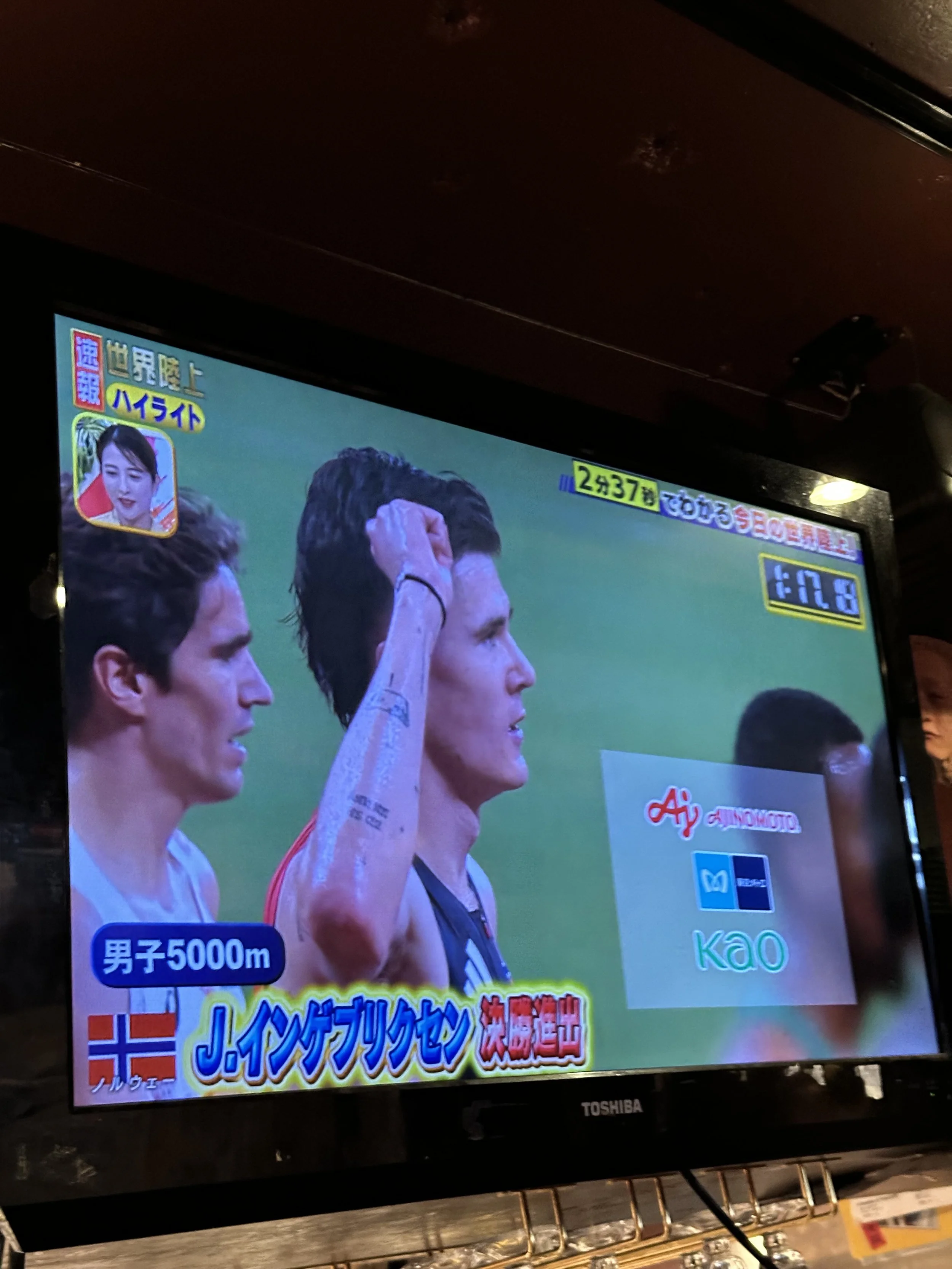 Two nights that week, we ended up at Abbot's Choice in Shibuya — a pub with big screens showing replays of the day's events. There is something funny about watching a replay of the 5000 metres on Japanese television, where the graphics are overflowing with kanji and the commentary is completely unintelligible, while drinking a cold beer after a long day in the stadium. I recommend it.